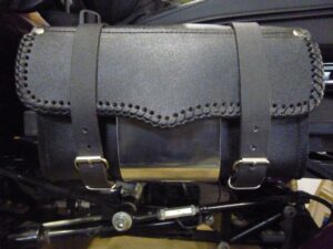 A leather bag with polished aluminium fixing bracket. The bracket will also retain the bags shape to stop in sagging and deforming over time. The bag is conveniently located to the side of the seat. A really useful item. Many other bags options available.
